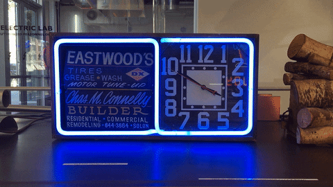 Today, MONA buzzes with relics from the neon's past and present: a giant green frog in a coat and top hat that used to dance on the Bakersfield grocery store currently greets visitors in the lobby. On another side of the room, dozens of neon clocks cover the wall. There's even a couple for sale, like this traveling salesman clock.