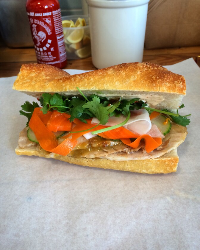 The Steve Julian is smoked pork loin, jalapeno vinaigrette, pickled carrots and daikon, cilantro, and bacon fat miso aioli.