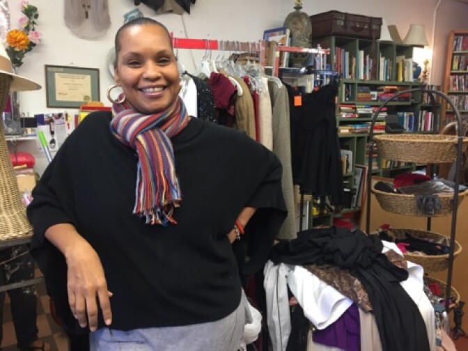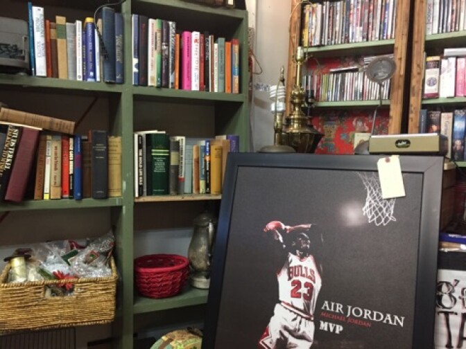 A huge painting of Michael Jordan takes up a corner of the store. There are typewriters tucked into the tall bookcases, vintage shoes lining the windows, and every color you can imagine is on the rack and on the walls. But this isn't an ordinary thrift store.