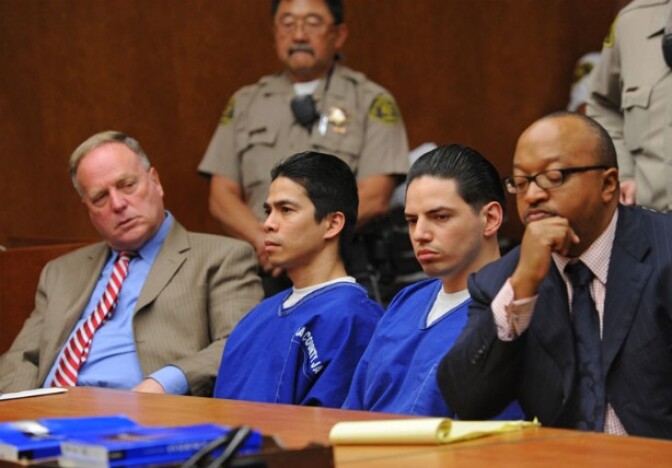 Eric Delacruz, left and Fernando Romero are sentenced in Torrance Superior Court for the murder of Sonia Risken (aka Black Widow) of Lomita. Defense attorneys Donald Levinson, far left, and Ludlow Creary III, far right.