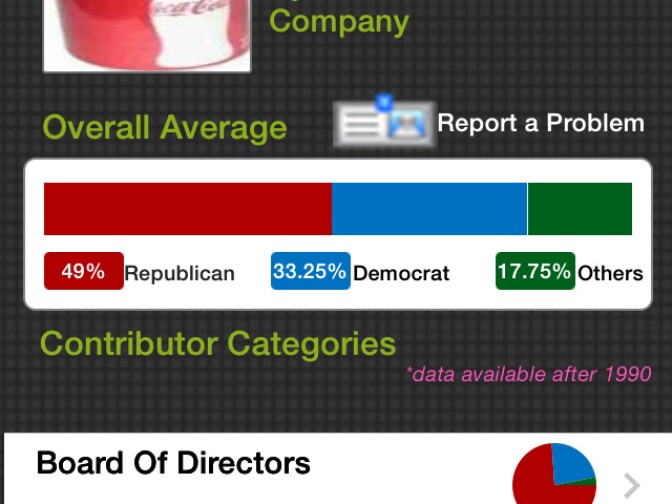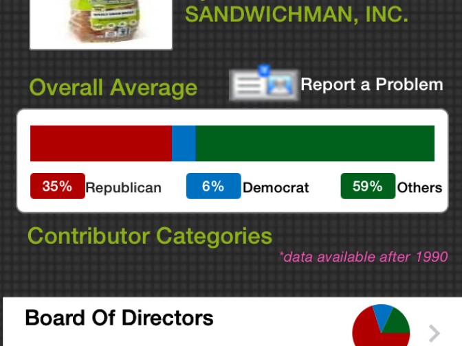 For example, a quick scan of Kashi Crunchy Granola Bars shows an overall average of 78.5 percent in Republican spending, 11.5 percent Democrat, and 10 percent "others." The data is compiled from the Center for Responsive Politics, the Sunlight Foundation and the National Institute on Money in State Politics. During an era that many analysts call “hyperpartisan,” the app might catch on quickly with constituents.