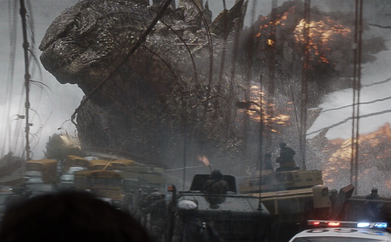 "Any time you saw Godzilla, or one of the creatures. It's sort of things that have been done before in CG, the difference with these creatures that we pushed, was their movement through the environment. So when they're fighting in the city, you'll notice as Godzilla swipes his arm, he swipes it through a cloud or fog bank or a dust cloud that he's swiping through vortexes off of his hand. It's to get that interactive environment happening amongst these creatures in the city, which is also the way that Gareth chose to shoot it.