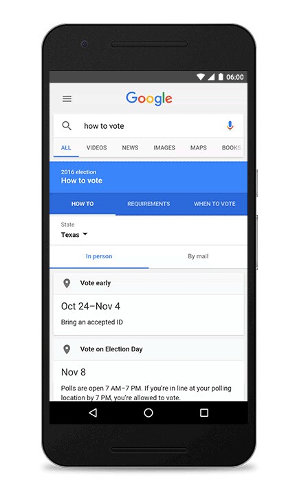 Type in a query about voting (something like "how to vote") and you'll automatically see a pop up box with information tailored to the state you're clicking away in.