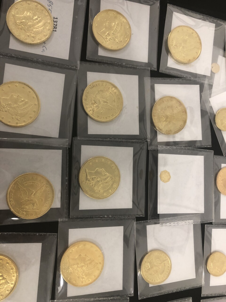 Evans catalogues each coin and artifact after he's finished working with it. The treasure includes gold dust and bars in addition to a variety of coins, including foreign-made coins and some from private mints.