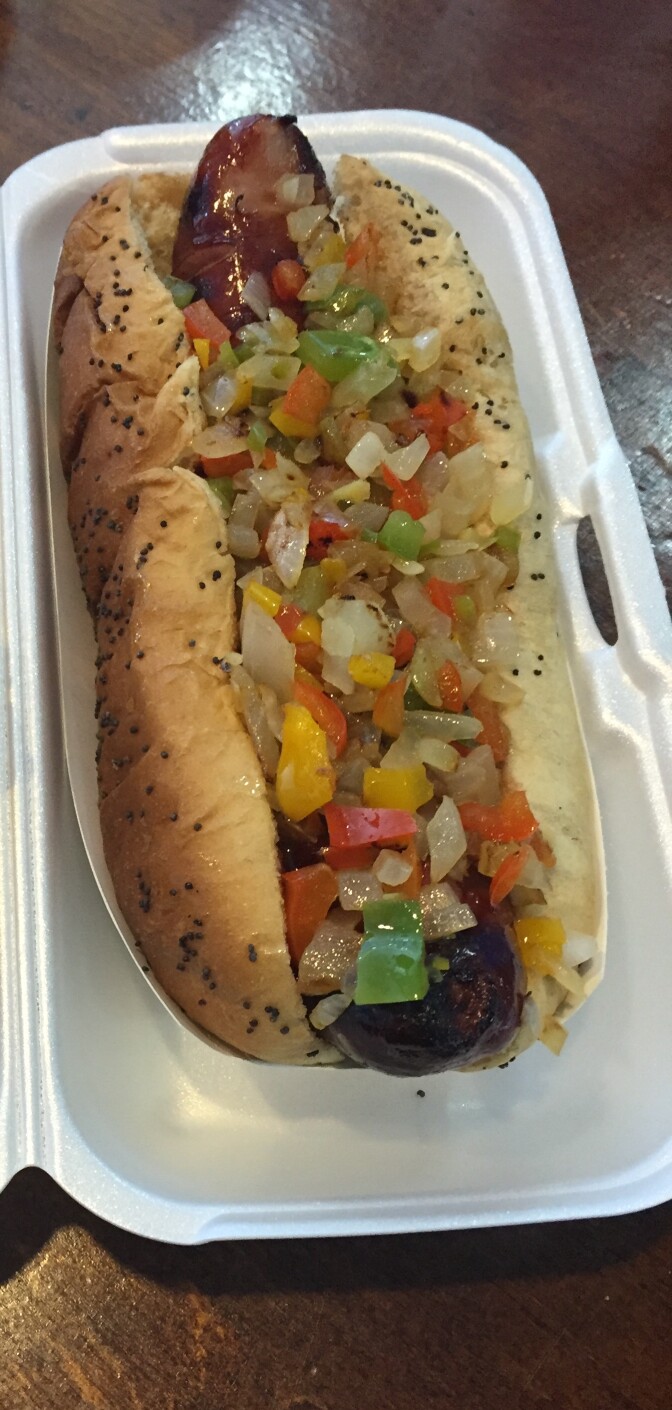 The sweet and spicy kielbasa, topped with a sweet chili glaze and chopped peppers and onions.