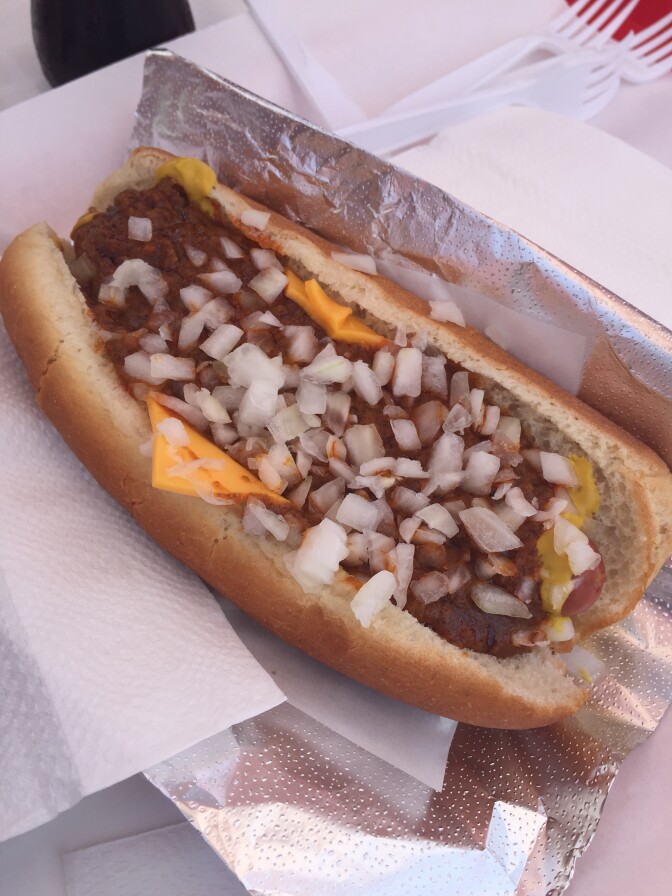 A classic Pink's chili cheese dog, with mustard and onions.