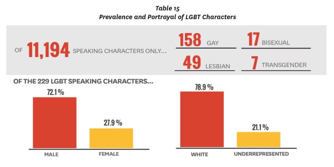 Even more underrepresented were people who identify as gay, lesbian, bisexual or transgender. In all, only 2 percent of speaking roles were LGBT. Only seven transgender characters were represented in the sample, and four of those characters were in the same series. LGBT characters were also predominantly white and male, according to the study.