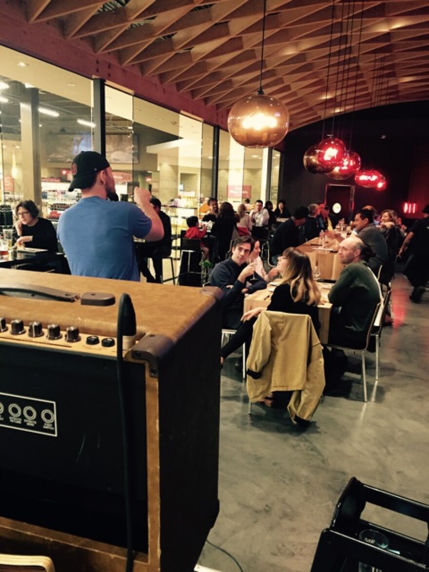 Technically he’s telling jokes at the Whole Foods in-store restaurant, called 110 & Bellevue. But with gapped glass partitions for walls, the audience can almost reach out and touch the organic produce.