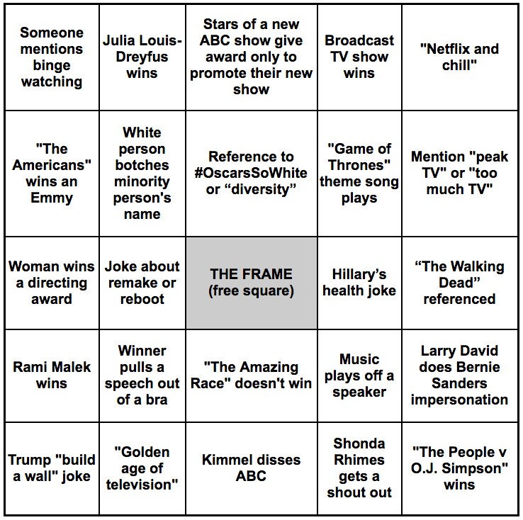 To make your Emmy watching more fun, The Frame has created an interactive Emmy bingo card: